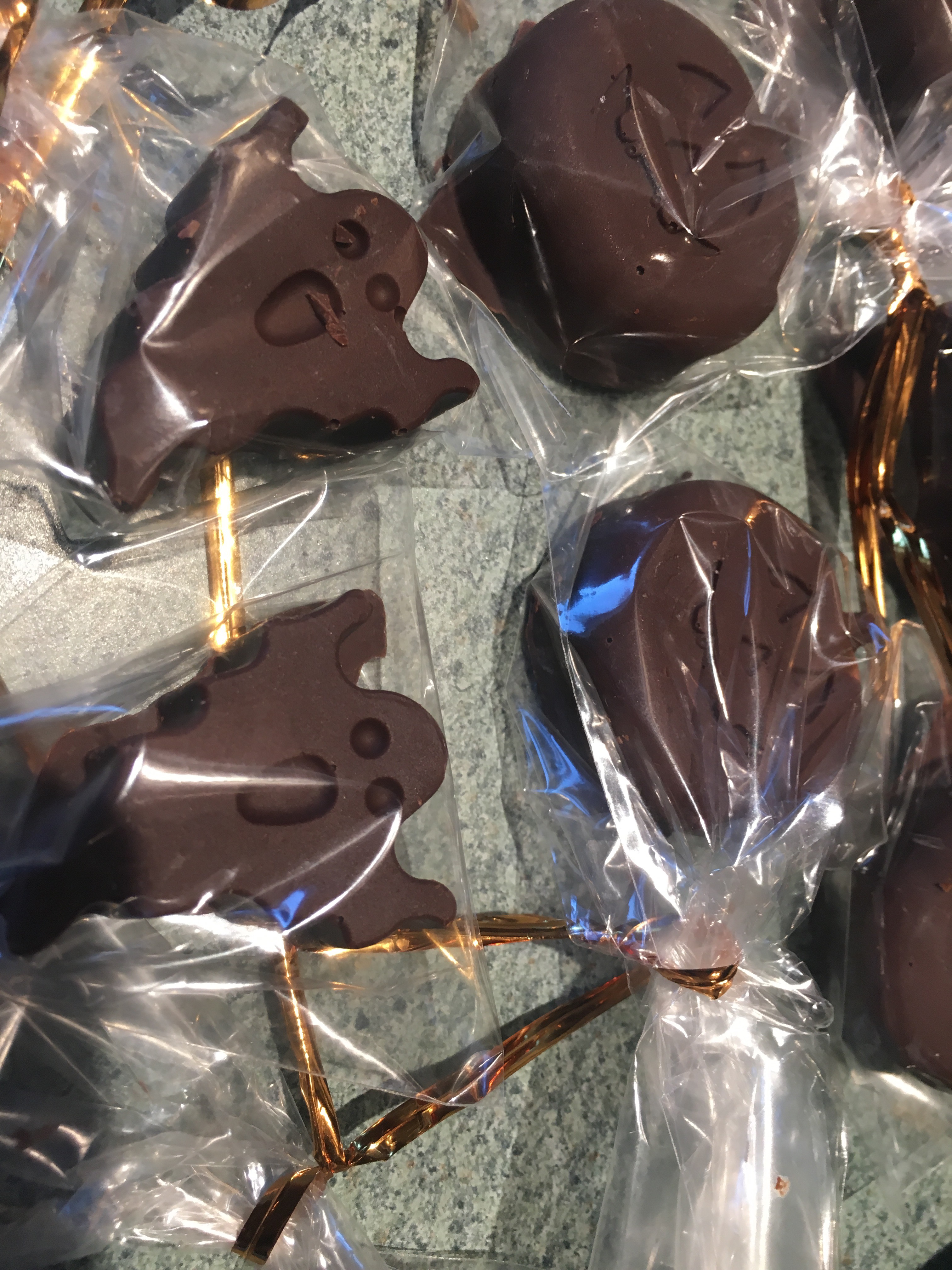 That said – our guy is a chocolate lover – so I can be found microwaving Enjoy Life mini chocolate chips pretty regularly, to pour them into chocolate molds. I made the ghost and pumpkin chocolates these way. The chocolate molds & storage stuff can be found at AC Moore. Be sure to use safe chocolates!